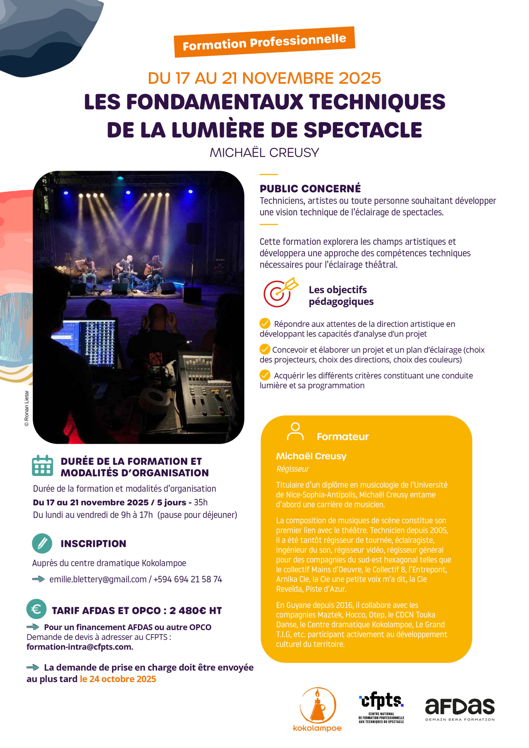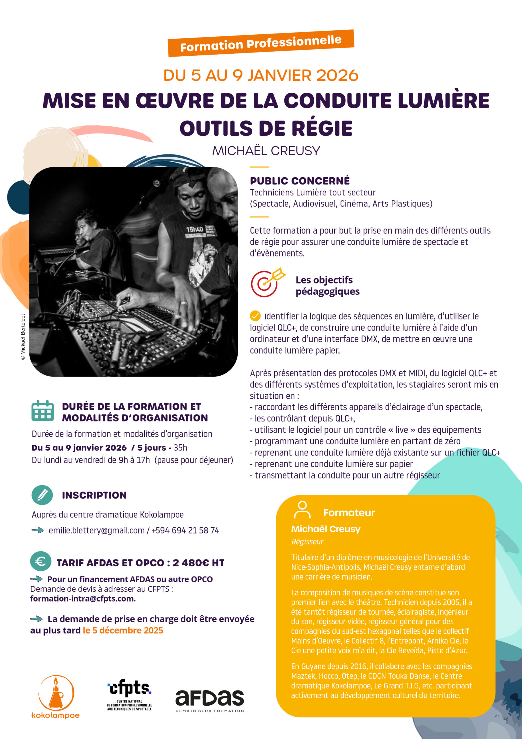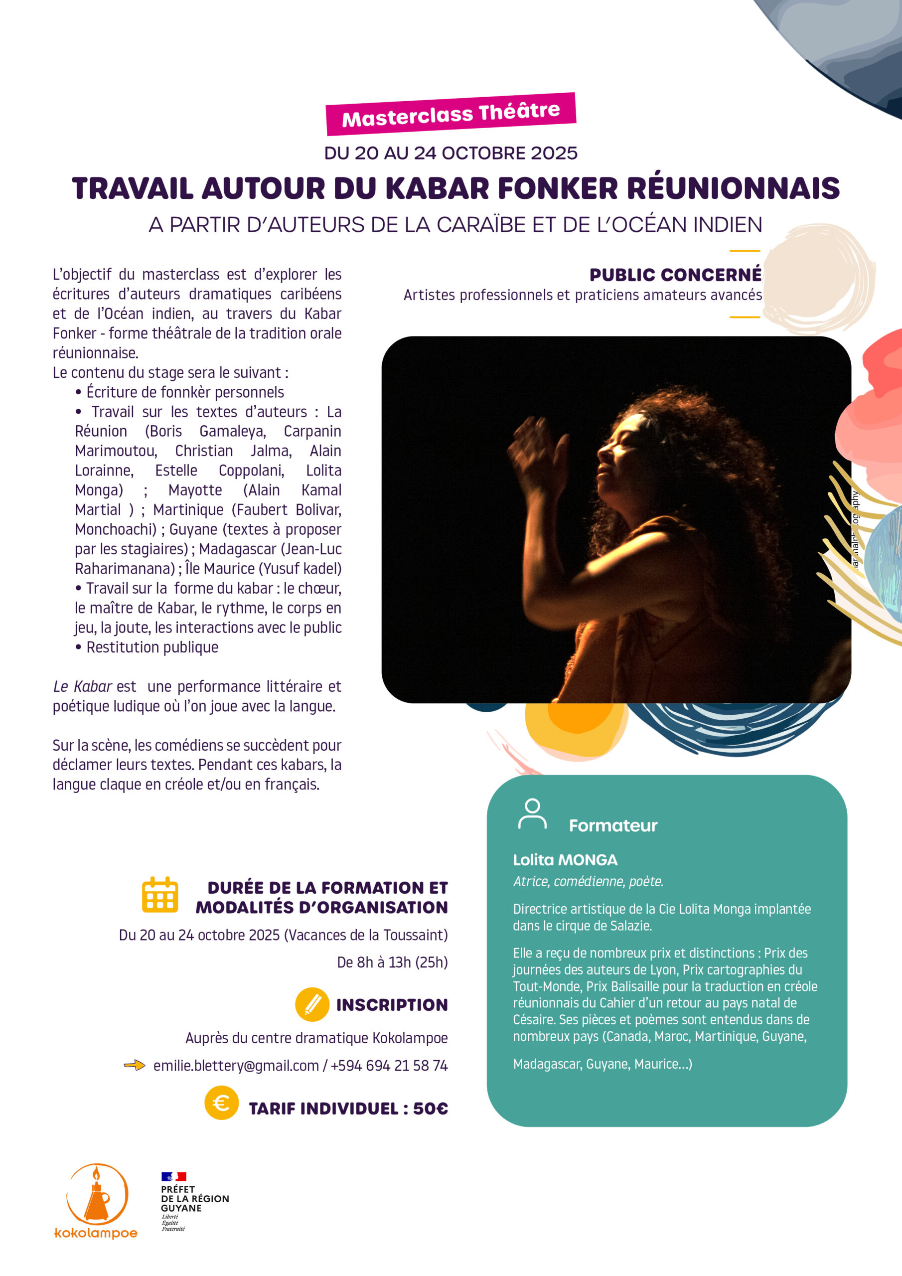 En tant que scène conventionnée d’intérêt national – Mention Art et Création, le centre dramatique Kokolampoe participe projets de création d’artistes émergents de Guyane et de la Caraïbe.
